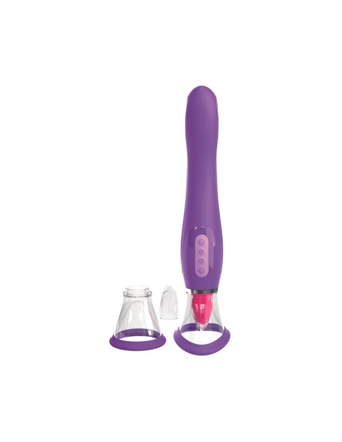 Questo vibratore a 4 motori e a due lati soddisfa ogni desiderio: l'asta leggermente ricurva raggiunge facilmente la zona G e stimola con 10 modalità di vibrazione. L'altro lato coccola il clitoride, i capezzoli e altri punti caldi con uno stimolatore a lingua in 7 modalità di movimento e una ventosa con 3 modelli di aspirazione che crea un vuoto con la semplice pressione di un pulsante. La funzione di rilascio del vuoto garantisce un divertimento sicuro. Tutte le funzioni possono essere comodamente controllate separatamente tramite i pulsanti.