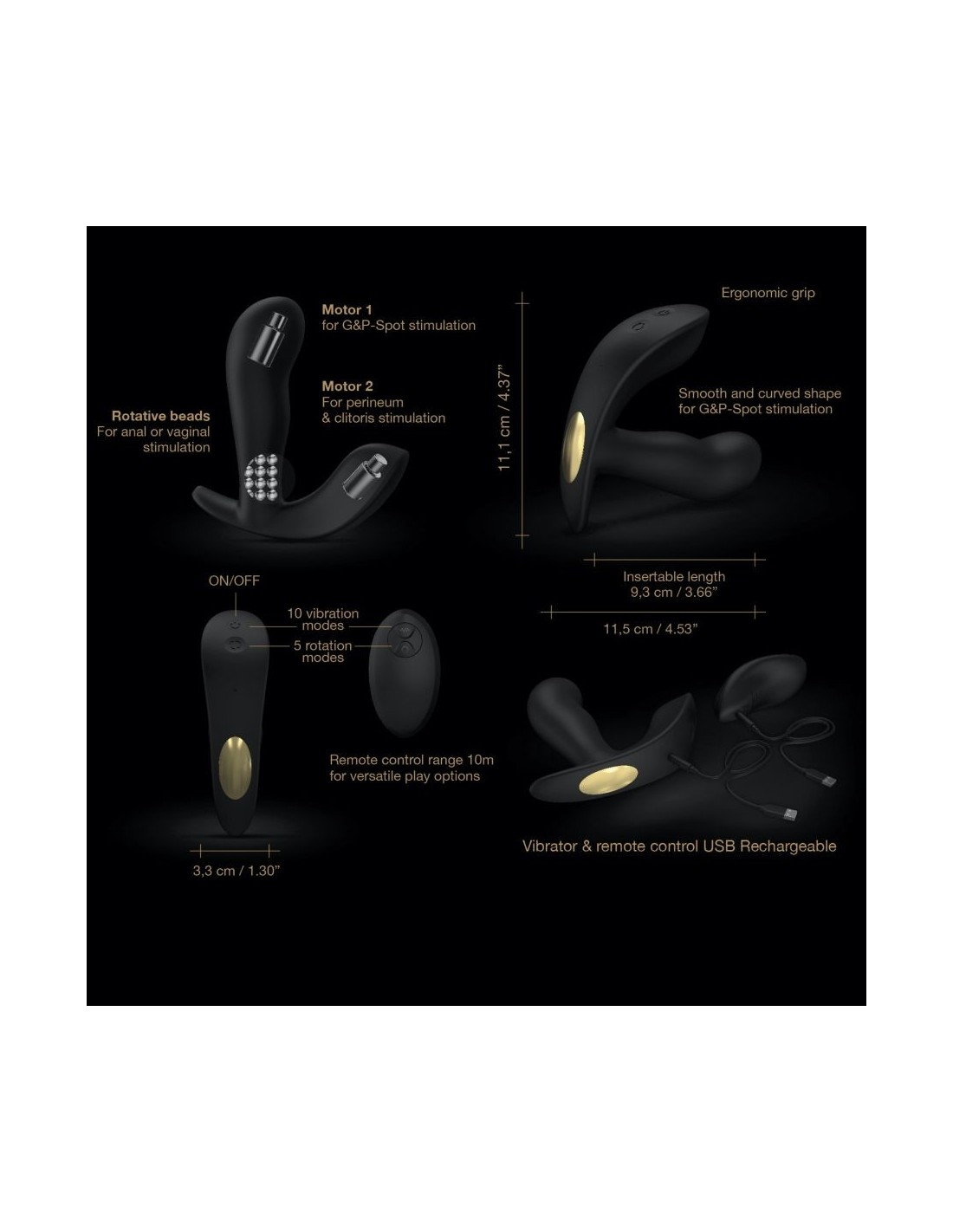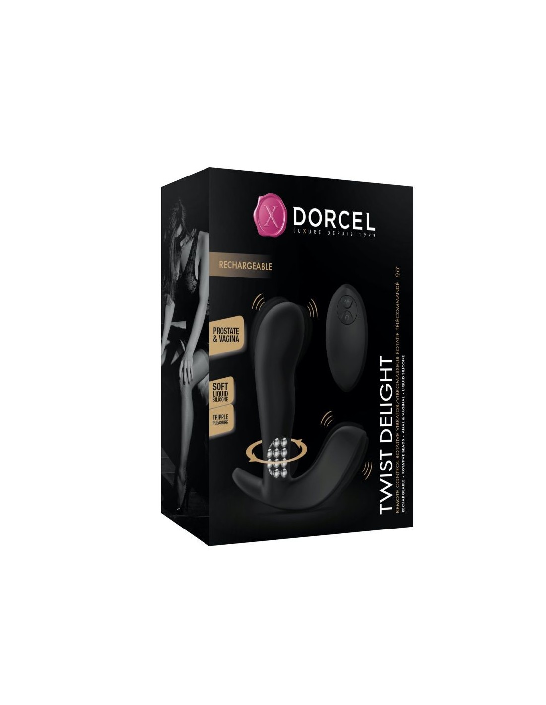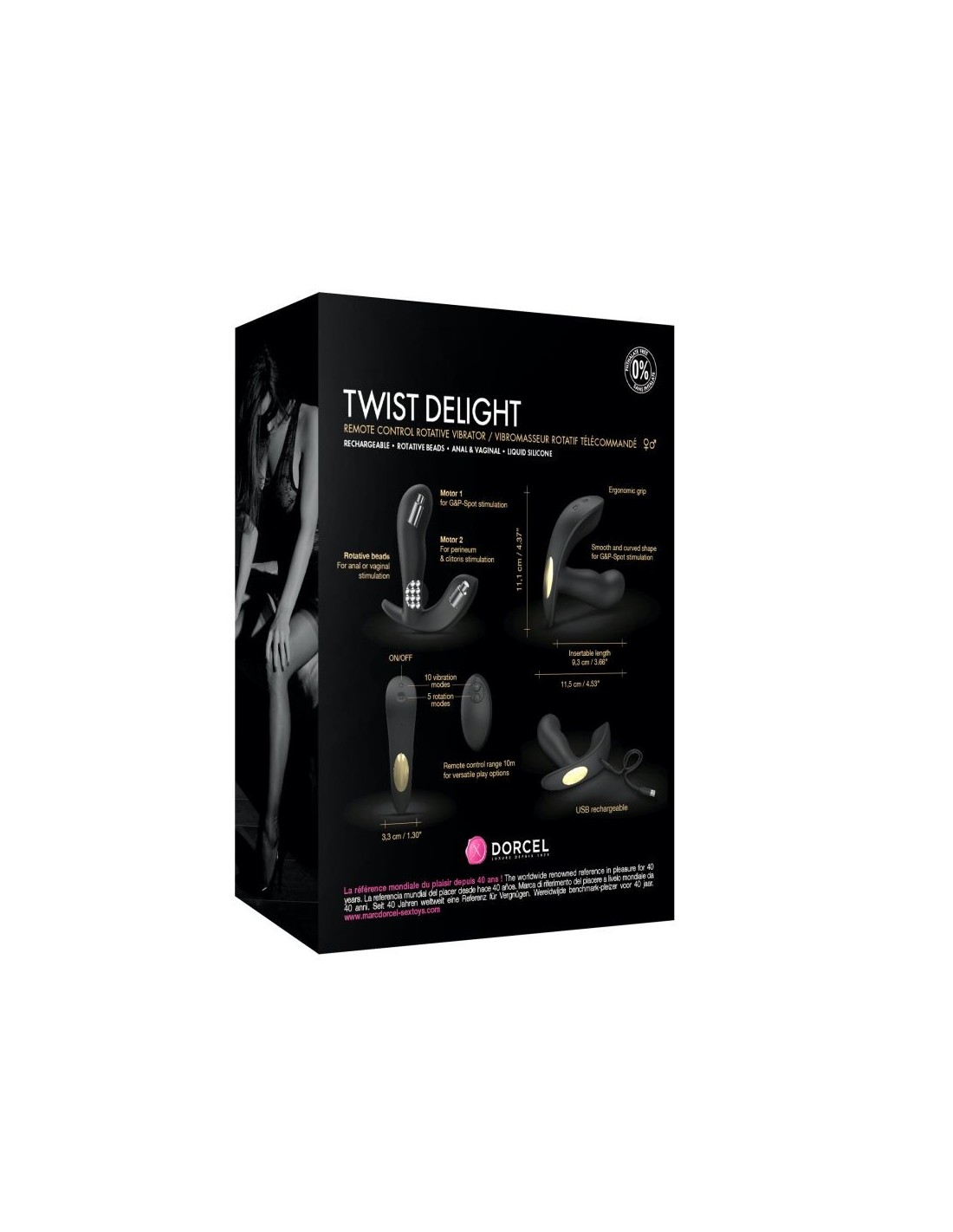 Per coloro che pensano che i loro orgasmi potrebbero essere ancora più intensi! Ti presentiamo TWIST DELIGHT, ingegnosamente progettato per soddisfare i tuoi desideri. Stimola tutte le tue parti intime, grazie ai suoi due motori vibranti e alle sue sfere rotanti che accarezzano le pareti vaginali e anali. Delicatamente o intensamente, sta a te scegliere tra le 15 modalità a tua disposizione. Grazie alla sua curva ergonomica, TWIST DELIGHT si diverte con il punto G e il punto P in tutta sicurezza. Dotato anche di un telecomando. Ideale per divertirti da solo o con il tuo partner, quando vuoi, ovunque tu vada! VANTAGGI Tripla stimolazione: 1. Testa vibrante 2. Sfere rotanti 3. Stimolatore esterno Curva ergonomica per il punto-G e P Palline rotanti per la parete anale e vaginale Stimolatore esterno per il perineo e il clitoride 10 modelli di vibrazione 5 modalità di rotazione INFORMAZIONI TECNICHE Dimensioni: 11,5x11xO̸3,5 cm/ 4,53'' x 4,33'' x 1,38'' Silicone liquido + ABS Autonomia: 0,5 ore Tempo di ricarica: 2 ore Livello sonoro: w< 50dbs Portata: 10 m Vibratore USB ricaricabile e telecomando (1 cavo incluso)