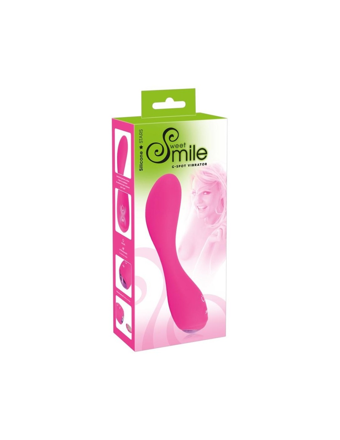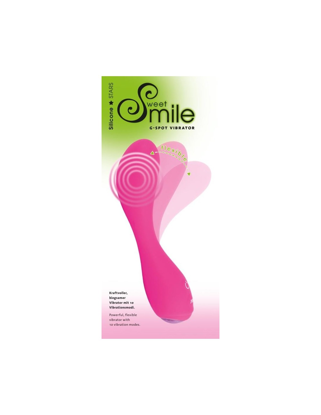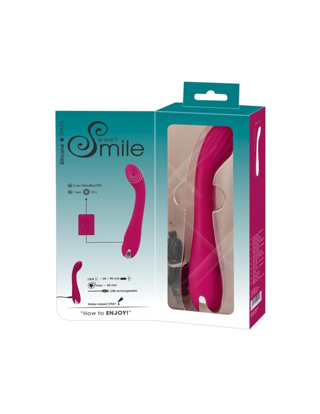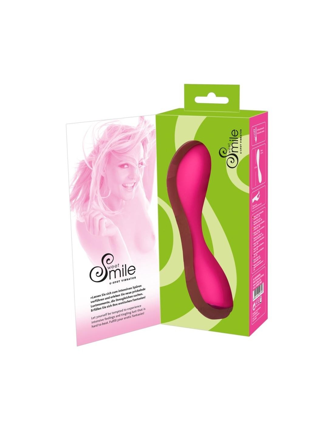 Vibratore per il punto G di Sweet Smile, ottimamente curvato, con collo flessibile e testa paffuta per la stimolazione precisa del tuo punto G vaginale. Può anche essere usato per stimolare il punto P anale. Un totale di 12 modalità di vibrazione fornisce un sacco di varietà e può essere comodamente controllato direttamente sul giocattolo al tocco di un pulsante. Rivestito dappertutto con una texture morbida e setosa, il vibratore fornisce una sensazione molto piacevole sulla pelle e sul corpo durante il gioco e la stimolazione. Ricaricabile - cavo di ricarica USB incluso.