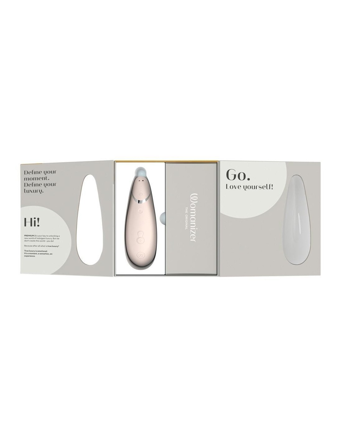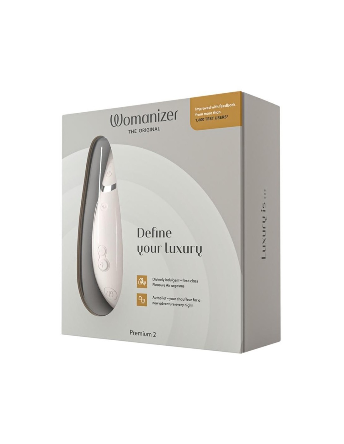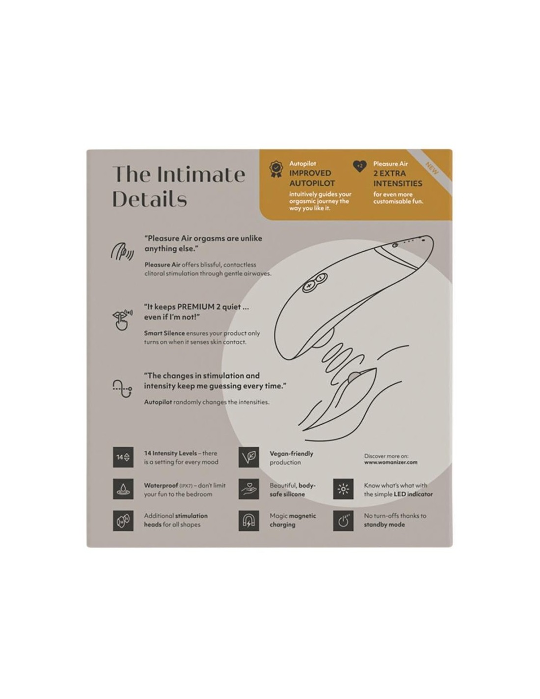 The Womanizer Premium 2 is a powerful but whisper quiet pressure wave stimulator that pleasures a person with 14 (instead of 12) different intensities. The intensities can be easily adjusted with the (+/-) button. The patented Pleasure Air technology provides precise stimulation of the clitoris without getting in contact with it. It can also be used in the bath or the shower because it is waterproof. The new and improved autopilot function changes the intensities automatically which will make the pleasure even more surprising. The Womanizer Premium 2 only starts once it comes in contact with the skin thanks to the Smart Silence function. Until then, the Premium 2 is in an almost silent standby mode. The Womanizer Premium 2 automatically turns itself off when it’s not been used for 5-10 minutes (depending on the amount of battery it has left). ). This can be bypassed easily, e.g. by pressing one of the intensity levels/autopilot.