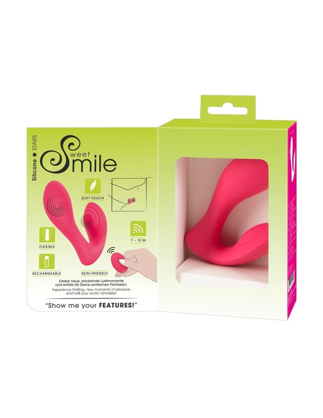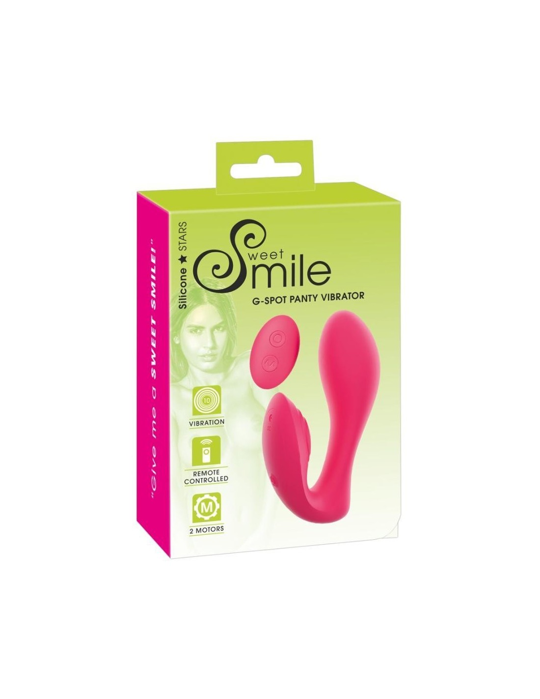 Vibratore Panty G-Spot curvo ergonomicamente ideale di Sweet Smile con 2 motori - uno nel vibratore flessibile del punto G e uno nello stimolatore clitorideo rivestito di riso. Ognuna delle 10 modalità di vibrazione può essere controllata separatamente con il telecomando con la semplice pressione di un pulsante - anche dal tuo partner (portata fino a 10 metri). Le vibrazioni silenziose, ma potenti coccolano sempre e ovunque - in modo del tutto discreto, senza che nessuno se ne accorga! Il materiale in silicone di alta qualità assicura un facile inserimento e una sensazione molto piacevole sulla pelle quando viene indossato e coccolato.